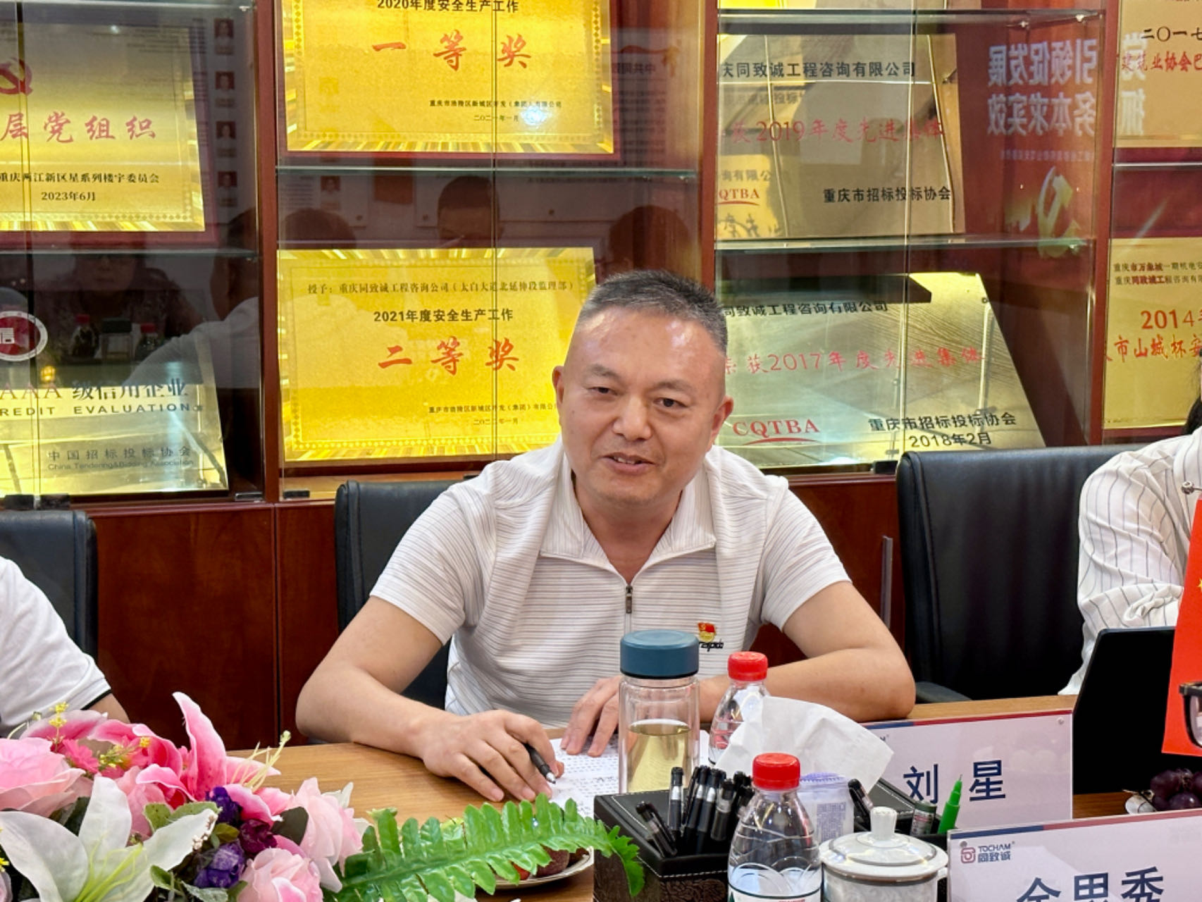 7月12日,重慶市招標投標協會會長李有余,會長助理、常務副秘書長余思秀,副秘書長兼會員部主任黃遠霞,副秘書長兼職業培訓部主任周振宇等一行蒞臨我司參觀考察。同致誠董事長張雷,黨支部書記劉星,副總經理、黨支部副書記何雨,總經理助理趙華燕等熱情接待,并在會議室展開交流座談。