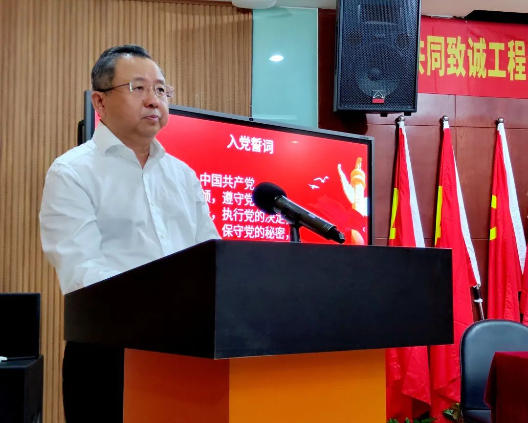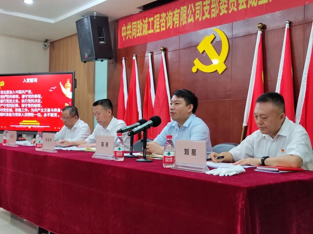 大會在莊嚴的國歌聲中拉開了序幕。兩江新區星系列樓宇黨委副書記陳濤首先宣讀了《關于同意成立同致誠工程咨詢有限公司黨支部的批復》。兩江新區政法委副書記楊建明和星系列樓宇黨委副書記陳濤共同為公司黨支部授牌,并為黨員代表佩戴黨徽。