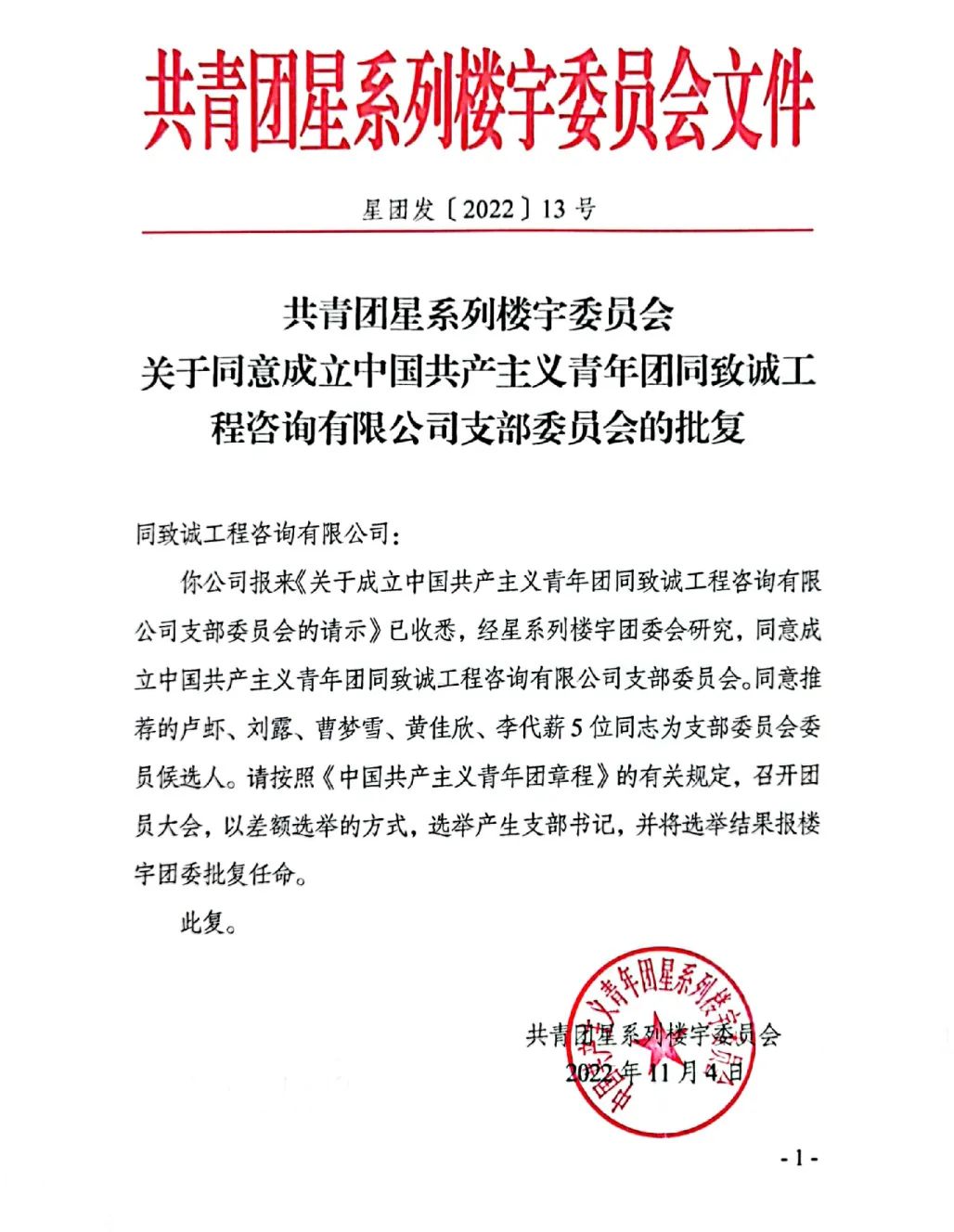 關于同意成立中國共產主義青年團同致誠工程咨詢有限公司支部委員會的批復