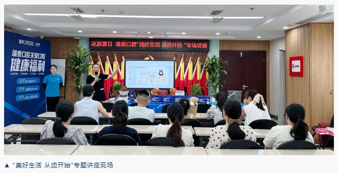 講座現場,公司特邀請到瑞泰口腔醫院的老師為大家現場授課。老師通過PPT、口腔牙齒模型展示、現場互動等方式,生動形象地講解了口腔健康知識和常見口腔疾病,科普了正確的刷牙方法、刷牙工具和口腔清潔理念。