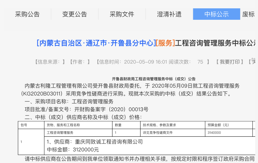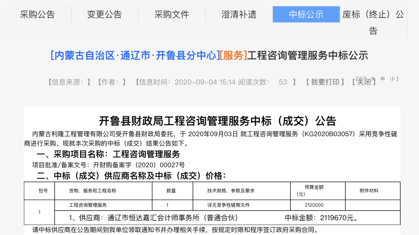 2020年9月3日,重慶同致誠(chéng)工程咨詢(xún)有限公司與通遼市恒達(dá)嘉匯會(huì)計(jì)師事務(wù)所組成聯(lián)合體,中標(biāo)“開(kāi)魯縣財(cái)政局工程咨詢(xún)管理服務(wù)” 供應(yīng)商,中標(biāo)金額為2119670元。