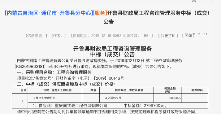 2019年12月13日,重慶同致誠(chéng)工程咨詢(xún)有限公司中標(biāo)“開(kāi)魯縣財(cái)政局工程咨詢(xún)管理服務(wù)” 供應(yīng)商,中標(biāo)金額為2799700元。