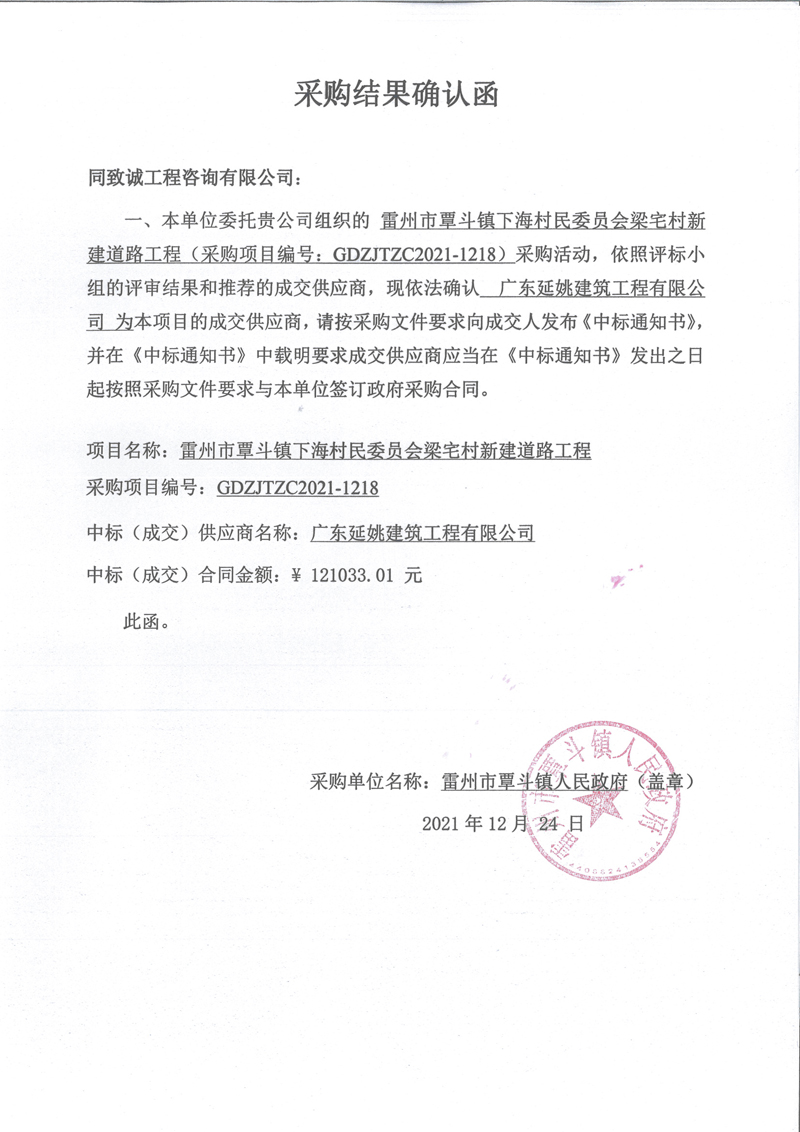 雷州市覃斗鎮(zhèn)下海村民委員會(huì)梁宅村新建道路工程 采購(gòu)確認(rèn)函